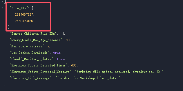找到File_IDs往里填模组的id(那么模组id如何获取呢?只需要在Unturned的steam创意工坊里面找到你想加入的模组,点进模组的详细界面,在左上角会显示一个网址,在网址中会有一串数字,那就是模组的id,只需要把id写在File_IDs后面的[]里面即可,如果需要安装多个模组,则每写完一个需要打,【英文逗号】后继续写下一个。)